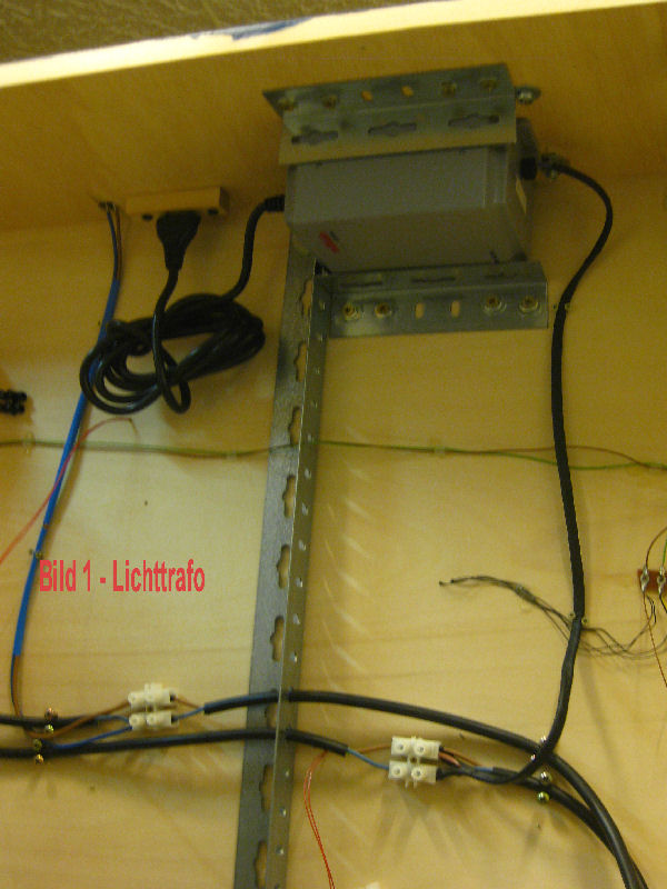 Bild 1 - Auf jeder Seite der Anlage wurde unter einem Modul ein preiswert erworbener Märklin-Lichttrafo für die Lichtstromversorgung aller Stromverbraucher (Weichenantriebe, Beleuchtung etc.) von Andy eingebaut und mit der Lichtringleitung verbunden. So penibel, wie mein Andy nun mal ist, hat er natürlich auch die Steckeraufnahme für den Transport nicht vergessen!