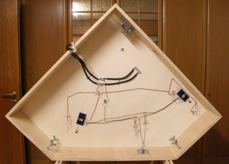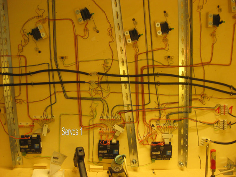 ..und die Technik und Verkabelung unter der Anlage. Die Weichen werden über Servos bewegt. Die Steuerung übernimmt analog ein Esu-Switchpilot. Die Betätigung der Weichen erfolgt vor Ort über Kippschalter in der Seitenwange des Moduls. Die querlaufende Metalllochhleiste dient der Versteifung des Moduls.