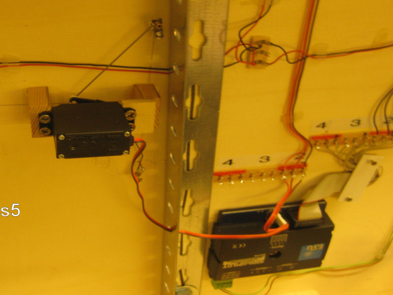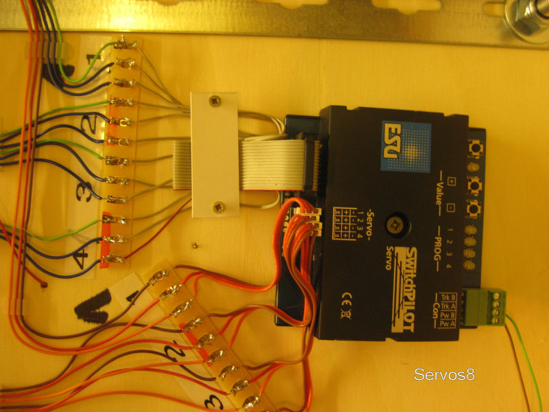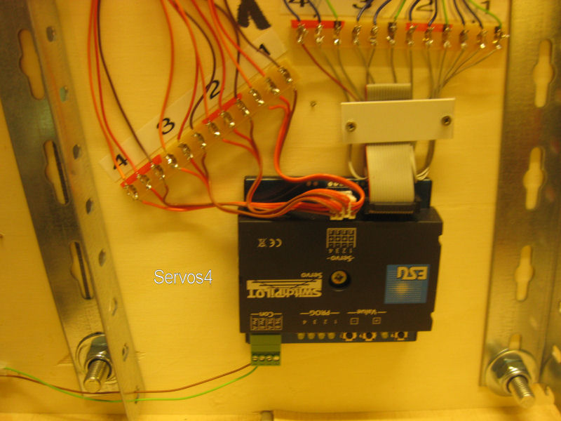 Bild 3 - Wir haben damit begonnen, die Weichenantriebe durch Servos zu ersetzen. Unsere Servos wurden über Conrad beschafft. Die Steuerung übernimmt ein ESU-Switchpilot, der analog angesteurt wird. Die Bedienung der Weichen erfolgt über Taster, die wie bisher die Weichenschalter, in den Seitenwangen der Module eingebaut sind. Vorteil der ganzen Geschichte: Die Servos laufen fast geräuchlos und sind besser einzustellen (Lage und Geschindigkeit). JA, ja, bei teilweise digitalem Betrieb braucht man nur 2 Kabel!