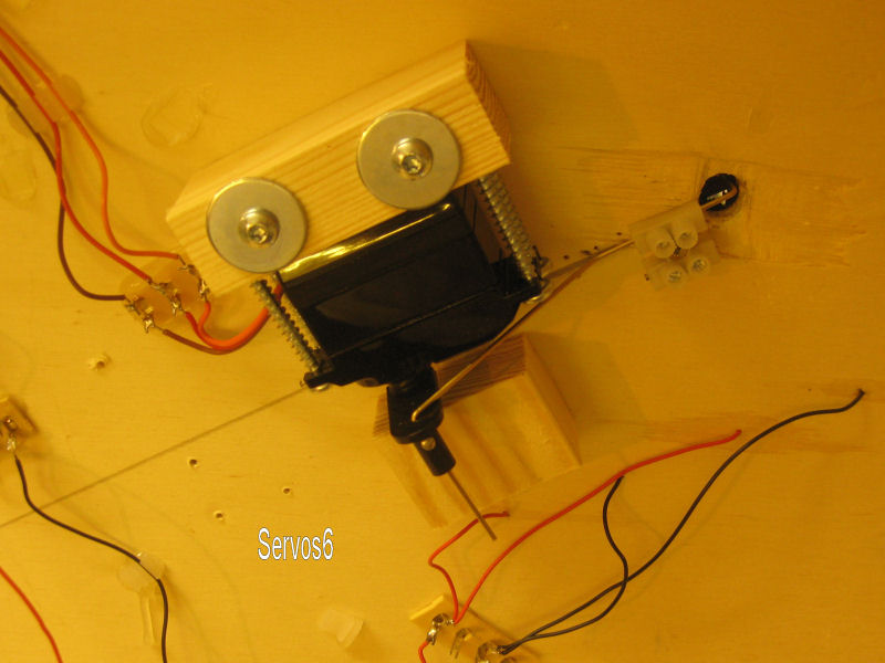 Bild 6 - Weichenantrieb mittels Servo. Die Stellstange ist am Servoende mit einer Steckerhülse fixiert. Angeschlossen ist eine grosse Bogenweiche. Über das überstehenden Ende der Stellstange wird noch die Polarisierung des Herzstückes angeschlossen.