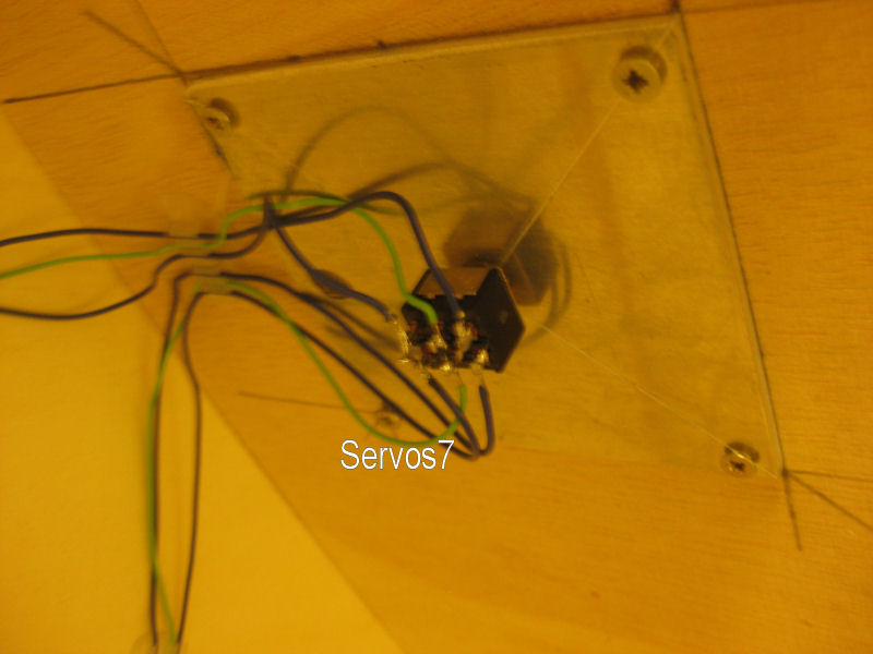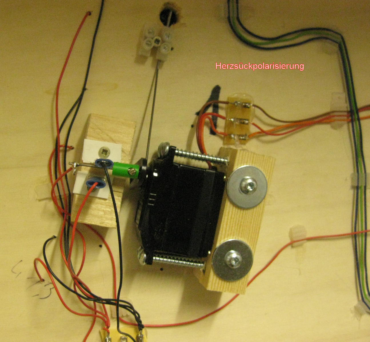 Bild 9 - die Herzstückpolarisierung über den Servo wird mittels der verlängerten Stellstange erreicht. Auf einem in der Höhe passenden Holzklotz sind zwei zurechtgesägte Plastikwinkel aufgeschraubt. Diese werden dem vorher eingestellten Stellweg der Weichenstellstange angepasst. Auf diese werden Stecker (Autoelektrik) aufgesteckt, an die Plus- und Minuskabel die Digitalstromversorgung angeschlossen werden. Auf die Stellstange (hinter dem aufgesschraubten grünen Stecker) wird das Herzstückkabel angeschlossen. Einfach, aber es funktioniert..Patent Andy!