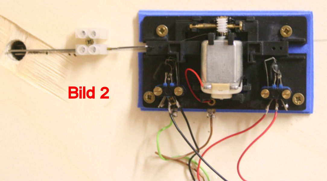 Bild 2 - Ein fertig montierter Fulgurexantrieb. Das braune und grüne Kabel kommen als Stellstromzuführung vom Kippschalter. Die schwarzen und roten Kabel führen zu den Umschaltern des Antriebes für die Weichenpolarisierung. Der digitale Fahrstrom wird an dem mittleren Anschluß der Umschalter angeschlossen (schwarzes und rotes Kabel). An einem der äußeren Pole werden die beiden Kabel der Herzstücke angelötet. Hier ist auf die Lagerichtigkeit (rechter oder linker Pol) zu achten (ausprobieren). Mit der Lüsterklemme wird das dem Antrieb beiliegende Führungsrohr des Stelldrahtes (1.0 mm) in der Lage festgehalten. Wir verwenden nicht den der Weiche beiliegenden Stelldraht. Bei neueren Weichen aus dem Walthers/Shinohara-Programm ist im reinen Digitalbetrieb eine Weichenpolarisierung nicht mehr erforderlich. Diese Weichen und Kreuzungen werden in der Produktbeschreibung des Herstellers als "DCC-friendly" bezeichnet.