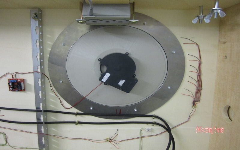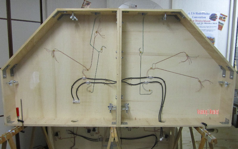 Verkabelung der Anschluesse im K&AW BW incl. der Cornerstonedrehscheibe. Links neben der Stabilisierungsstrebe liegt der Polwender für die Scheibe. Oben ragt der fest installierte Lichttrafo ins Bild.