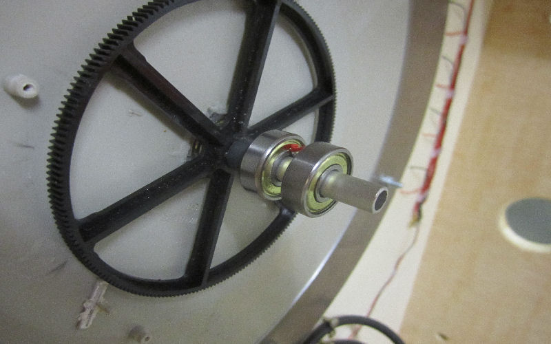 Andy gefiel das Laufverhalten und die Bewegungen der Drehscheibenbrücke überhaupt nicht. Also die eigentliche Brücke erhielt gescheite Metallräder und der gesamte Drehmechanismus flog raus! Jetzt läuft alles in Kugellagern. Irgendwann schmeist er wohl auch noch den Motor weg! Nun läuft das Ding wie ein schnurrendes Kätzchen. Unser geliebter Perfektionist!