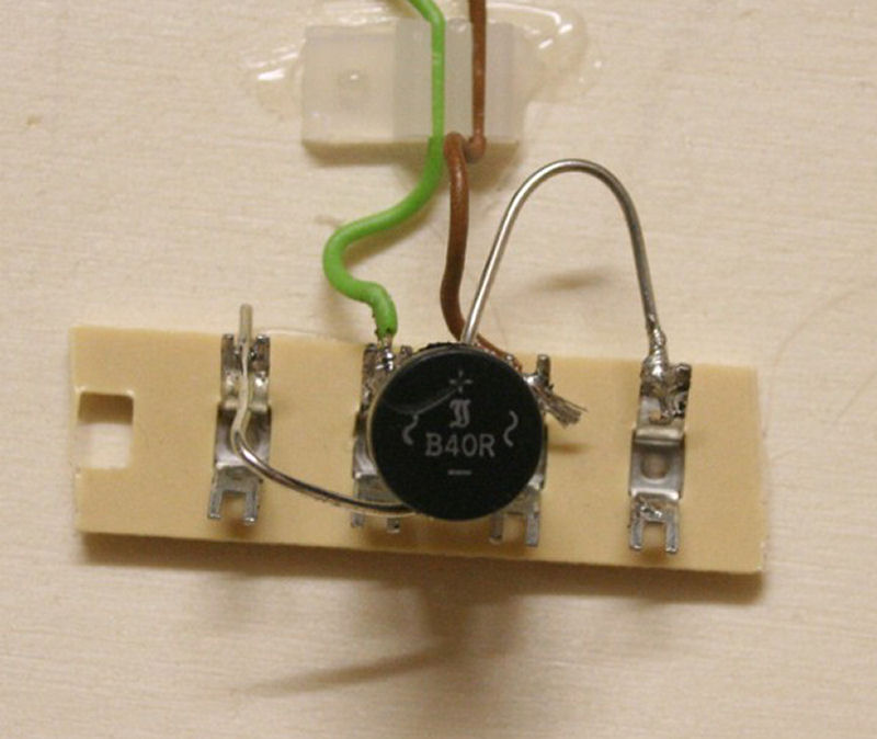 Bild 1 - Fulgurexantriebe sind Gleichstromantriebe. Um diese Antriebe mit analogem Wechselstrom aus der Anlagenversorgung betreiben zu können, ist ein Gleichrichter erforderlich. An einen Gleichrichter können, lt. Aussage des Verkäufers bei Conrad, ohne Probleme bis zu vier Weichen angeschlossen werden, wenn diese Antriebe nicht gleichzeitig geschaltet werden. Wir haben die beiden "Füße" des Wechselstromanschlusses des Gleichrichters (auf dem Gleichrichter mit dem Wechselstromsymbol versehen) auf einer Lötleiste eingelötet (mittlere Anschlüße). Hieran angeschlossen ist die Stromzuführung von der Wechselstromquelle (Lichtanschluß) des Trafos. Die beiden anderen Beine des Gleichrichters (auf dem Gleichrichter mit + und - bezeichnet) wurden ebenfalls auf die Lötleiste gelötet. Hieran angeschlossen sind die Kabel zum Stromanschluß der Antriebe (äußere Kabel).