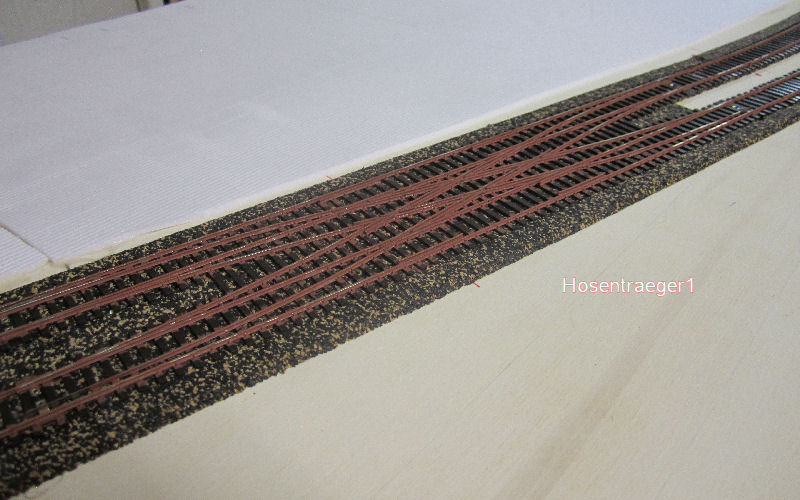 Der eingebaute und "angerostete" Hosentraeger auf der Anlage. Nach dem Einschottern wird er nochmal mit Staubbraun eingesprüht