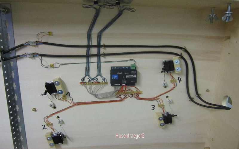 Bild 7 - Anchlüsse des Stelltasters. Es handelt sich um Kipptaster. Hier sind 2 Bogenweichen angeschlossen, die somit gleichzeitig gestellt werden können.