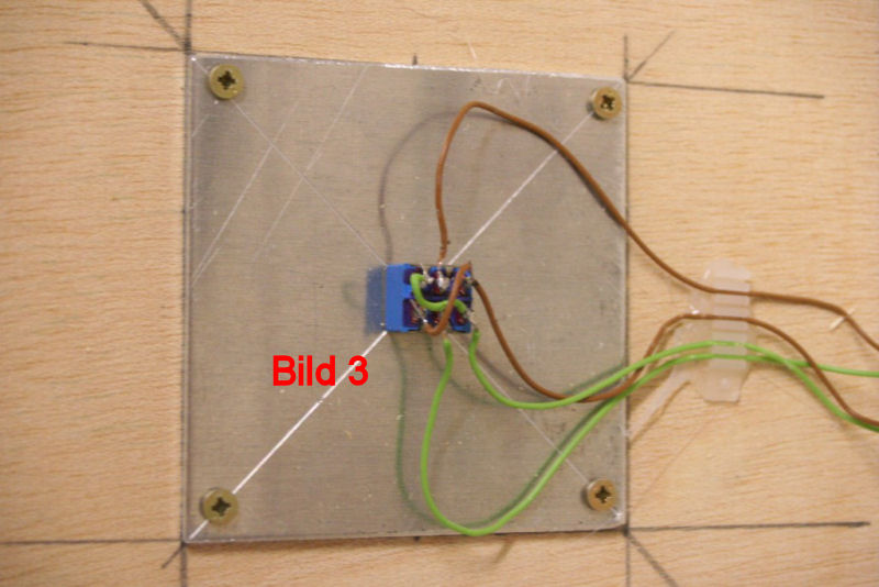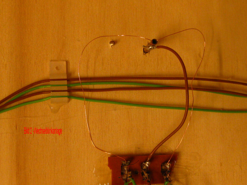 Bild 2 - Die Anschlüsse des Warnkreuzes: Die beiden "blanken" Kabel führen im Warnkreuz zu den LED`s. Das zweite Kabel der LED`s (Masse) ist in Höhe der Lampen auf dem Messingmast aufgelötet. Am Fuss des Mastes unter der Anlage wird der (Masse)Mast mit einem Kabel für die Masse versehen. Alle Kabel werden zum Schaltmodul geführt und dort, wie oben beschrieben, angeschlossen.