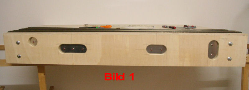 Eckmodul mit eingebauter Fahrstromringleitung. Oben links ist die Anschlußlüsterklemme der Ringleitung für das nächste Modul zu sehen. Darunter das "lose" Ende der Ringleitung zur Weiterführung in das folgende Modul. Damit die Enden beim Stapeln oder zum Transport nicht lose herunterhängen, haben wir das Ende in eine Lüsterklemme gesteckt. Die Leitung ist einmal unterbrochen, um Strom abnehmen zu können. Die Steckerleiste wird noch durch eine Lötleiste ersetzt. Alle "losen" Anschlüsse werden von uns auf Lötleisten gelötet. Am Modul zu sehen sind links und unten die Durchführungsöffnungen für die Leitungen zum jeweils nächsten Modul. Die Halterungen mit den Flügelmuttern dienen der Beinbefestigung. Das Kopfbrett eines weiteren Moduls ist mit den Bohrungen für die Verbindungsschrauben versehen. Damit die Bohrungen immer gleich liegen, haben wir uns eine Bohrschablone aus einer Holzplatte angefertigt.