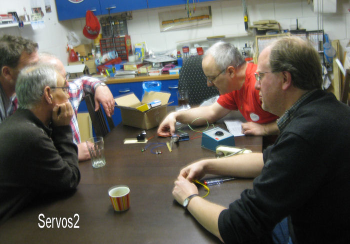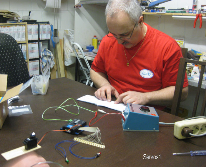 Bild 1 - Wir bauen um auf Servos! Das Gejaule der Motorantriebe nervt. Außerdem immer wieder Stellprobleme. Der Servodecoder kommt von ESU. Er kann auch analog über Taster angesteuert werden. Hier der Versuchsaufbau, den Andy ausgetüftelt hat. Ja, er kann sogar Bedienungsanleitungen lesen!