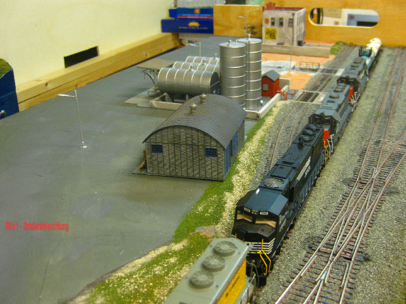 Der 2. Wendekopf ist mit seinen 3 Gleisen ferig verkabelt. Die Gleise laufen oben in einem "Tunnel". Ueberbaut wird der Tunnel mit einem kleinen Stadteil von Dakota-City.