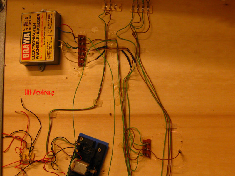 Bild 1 - Einbau der Elektrik für die Wechselblinkanlage des Bahnübergangs. Das Schaltmodul stammt von Brawa. Der rote und der blaue Kabelanschluß des Moduls wird an die Wechselstromversorgung angeschlossen, wobei das rote Kabel noch über den Kippschalter in der Seitenwange des Moduls geführt wird. Die beiden weissen Kabel führen zu den Lampen der Warnkreuze. Das grüne Kabel ist die Masse für die Warnkreuze.
