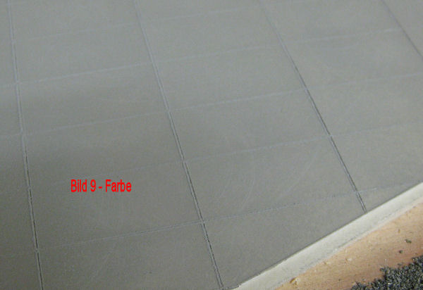 Bild 9 - Nach dem Gravieren wird die Kunststoffplatte mit der Heki Straßenfarbe "Beton" eingefärbt. Hierzu wurde ein Farbroller benutzt. Nach dem Abtrocknen fühlt sich die Farboberfläche rauh an. Um die Konturen zu verstärken, kann der Farbauftrag mit einen feinen Schleifpapier abgezogen werden.