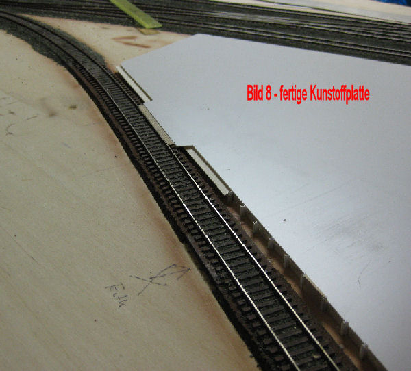 Bild 8 - Die fertige Platte - nix zu sehen bei unseren Fotografierkünsten! Aber die Farbe folgt! Auf diesem Foto ist gut der Magnet für den Entkuppler der Kadeekuplungen zu sehen.