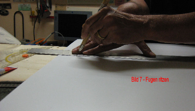 Bild 6 - Nun müssen die Fugen der einzelnen Betonplatten geritzt werden. Die einzelnen Platten werden 4 x 2 cm groß. Die Maße haben wir mit Bleistift auf die Platte übertragen. Das Einritzen der Fugen wird mit einer Radiernadel ausgeführt. Um wirklich gerade Fugen zu erhalten, führen wir die Nadel an einer Aluschiene vorbei.