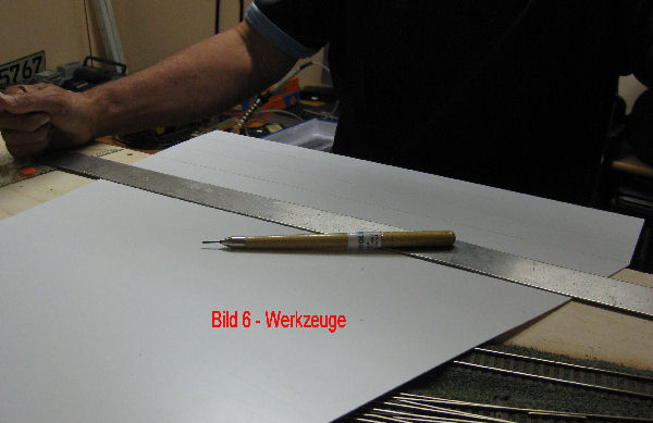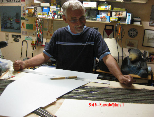 Bild 5 - Auf den bisher gefertigten Aufbau wird jetzt eine 1 mm starke Kunstoffplatte aufgelegt. Zum genauen Ausschneiden der Platte haben wir uns wieder eine Papierschablone angefertigt. Die Platte kann mit einem scharfen Cuttermesser oder Scalpell ausgeschnitten werden.