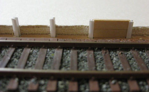 Am Gleis zur Viehverladung kann direkt vom Truck in Eisenbahnfahrzeuge verladen werden. Hierzu wird ein Teil dieses Gleises mit einer Ladekante versehen. Sie besteht aus senkrecht eingebauten H-Trägern aus Kunstoff und 1 x 5 mm starken Holzleisten. Der Abstand zwischen den einzelnen Trägern beträgt 2 cm. Entgegen dem Foto werden wir nur ein "Brett" einbauen. Für die H-Träger haben wir passende Löcher (3.5 Bohrer) in die Grundplatte gebohrt.