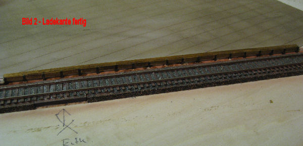 Ladekante - Zuerst eine Lindenholzleiste 1x5 mm mit Holzbeize einstreichen. Diese Leiste wurde oben auf den Betonplattenbelag mit Ponal Express geklebt. Diese Leiste dient als Überfahrschutz für die Straßenfahrzeuge (bis hier hin und nicht weiter!). Danach wurden die vorher mit Staubbraun lakierten H-Träger in die vorgebohrten Löcher mit Ponal eingeklebt. Nun noch eine Lindenholzleite entsprechend ablängen und die Teile zwischen die Träger kleben und die Holzsteifen beizen. Ich haben die Beize auf die Holzteile zweimal aufgetragen. Fertig!