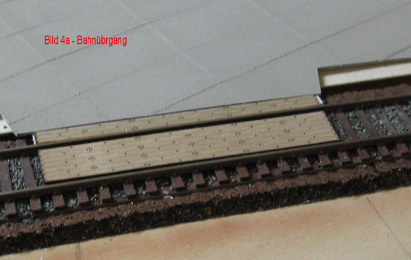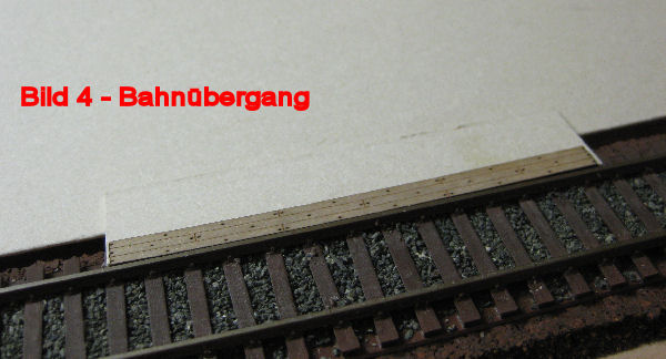 Bahnübergang - Der Raum zwischen den Schienen ist mit den Teilen des Lasercutsatzes gefüllt. Bevor geklebt wird, muß mit einer Lok die genaue Lage festgelegt werden, um ein Auflaufen der Radsätze auf dem Holzstreifen zu verhindern. Der 2. Aussenstreifen wird erst eingebaut, wenn das Geländeauf dieser Seite der Schiene eingebaut ist.
