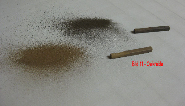 Bild 11 - Die Alterung/Verschutzung wird mit Künstlerkreide (Oelkreide) aufgetragen. Hierfür werden 2 unterschiedliche Farbstäbchen verwendet. Mit einem Scalpell wird leicht über die Oberfläche der Stäbchen gekratzt. Hierbei bildet sich feiner Staub. Dieser Staub wird mit einem nicht zu harten Pinsel in die Farbe gerieben. Der feine Kreidestaub bleibt auch in den Fugen liegen.