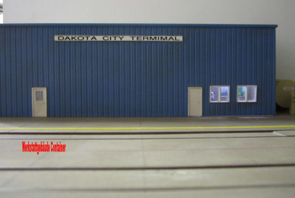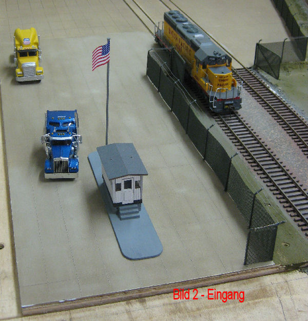 Die LKW-Zufahrt mit dem aus einem Busch-Bausatz /Checkpoint Charly entstandenem Abfertigungsgebäude. Andy hat das Gebäude auf einen Sockel gesetzt, um die Fensterhöhe amerikanischer Monstertrucks zu erreichen. Vor den Eingangstüren des Gebäudes hat er noch Treppen angebracht. Der Abfertiger sitzt auch schon auf seinem Stuhl. Dahinter steht die unausweichliche US-Fahne. Starker Westwind! Das Gebäude wird noch mit einem Firmenschild versehen. "DCT" Dakota -Container-Terminal - Damit steht auch der Name der Stadt fest, indem sich dieser Terminal befindet! - DAKOTA-CITY- Die Einfahrt wird nun noch ergänzt mit Zaun, Ein- und Ausfahrtschranken und gelben Straßenmakierungen.