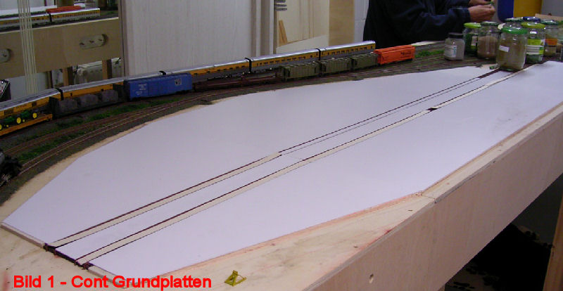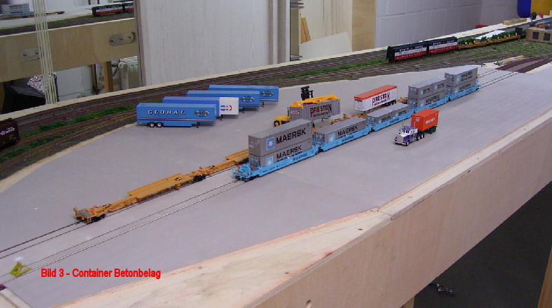 Bild 1 - Der Aufbau der Fläche wurde wie bei der Ladestraße gefertigt. Nur natürlich erheblich größer und aufwendiger, da die Schienenzwischenräume der beiden Ladegleise auch gefüllt werden mußten (hier fehlt teilweise noch der Plastikstreifen). Im Vordergrund werden später an der Hintergrundkulisse Container stehen. Ganz rechts wird eine Werkstatt entstehen. Auf der anderen Seite wird Platz für die Trailer sein. Verladen wird mit Großstablern (auf Bild 1a wäre, wenn aufgeräumt, einer klar zu sehen). Eine Verladebrücke werden wir nicht einbauen. Am rechten vorderen Ende wird der Straßenzugang mit einem überdachten Abfertigungsgebäude entstehen. Wir sind übrigens nicht schwanger! In den Gurkengläser ist Streumaterial etc.