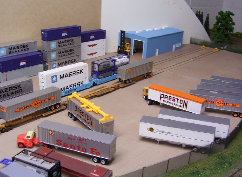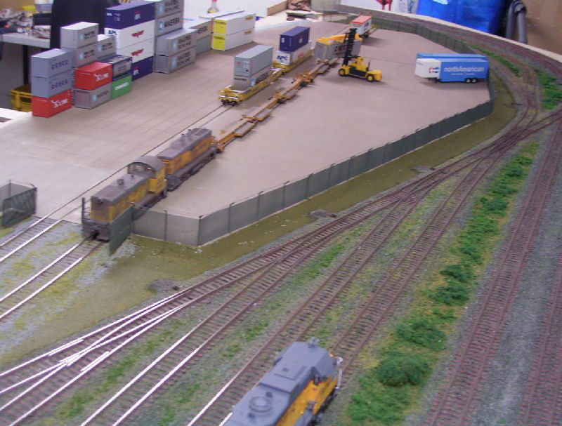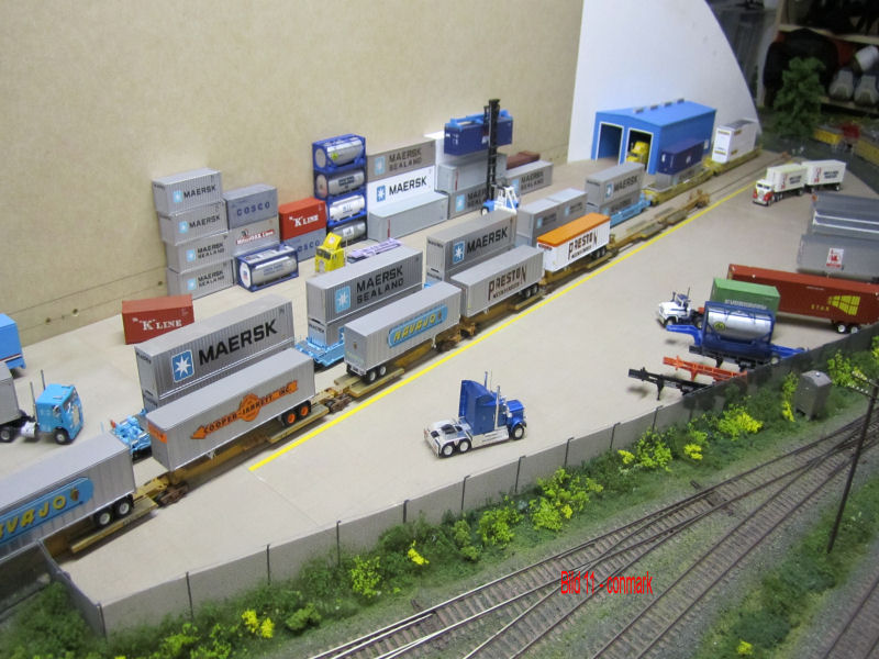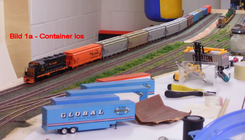Bild 1a - Dieser Teil von Beans steht in Andy`s Keller. Das Bild zeigt einen Teil des mit jede Menge "Zeugs" vollgestellten zukünftigen Container- und Trailerbahnhof. Im Hintergrund endlich mal eine Lok von Bernd`s Lieblingsrailroad Rio-Grande. Mal nicht quitschegelb! Loks und Wagen gehören aber Andy (bis auf den Rio-Grande Hopper). Nach dem Andy überredet werden konnte, mal aufzuräumen, kamen wir endlich zu