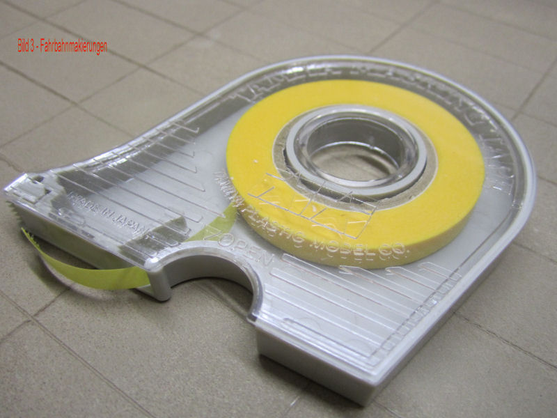 Bild 3 - Das Abklebeband von Tamiya gibt es in verschiedenen Stärken: 6,8,10 und 12 mm. Andy hat sich in das 6mm dünne Band verliebt. Es klebt so stark das keine Farbe unterlaufen kann, aber es bleibt beim abziehen nichts dran kleben. Außerdem kann man mit dem dünnen Band auch Kurven kleben. Andy verwendet es auch zum abkleben bei Modellen zum Airbrushen.