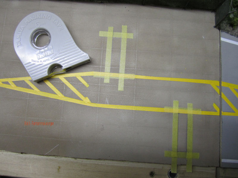 Bild 4 und 5 - Nachdem die zweite Außenlinie auf die selbe Weise entstanden ist, klebt Andy die Querlinien ab und malt anschließend die Zwischenräume mit " Flat yellow" von Model Master aus.
