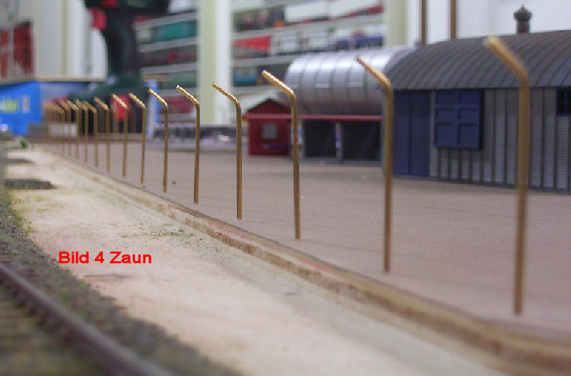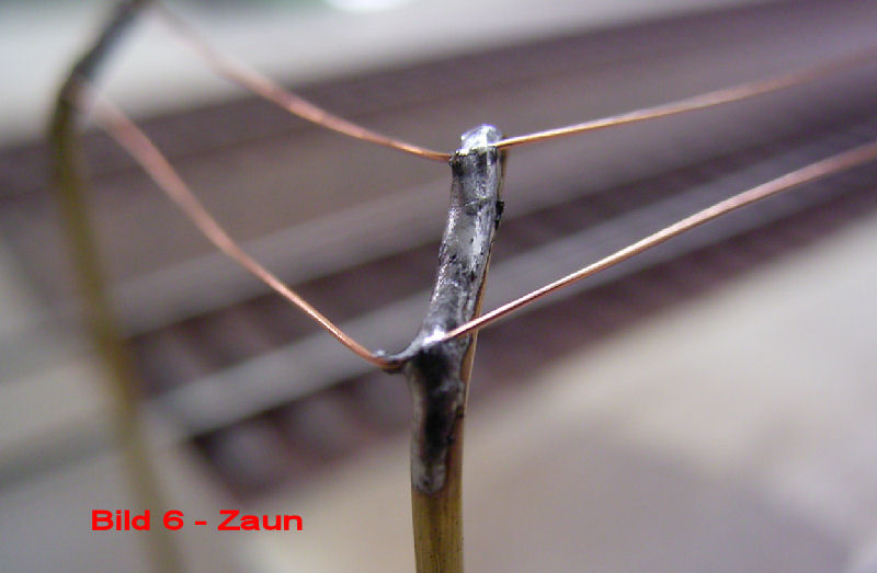 Bild 6 - Nach dem setzten der Pfosten, wurden auf die Schräge 2 klarlackummantelte Kupferdrähte in 0,15mm Stärke aufgelötet. Diese wurden später noch Eisenfarben angemalt.