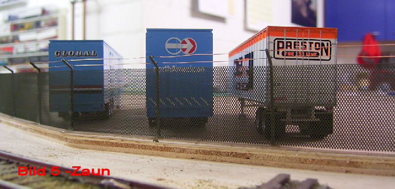 Bild 7 - Anschließend schnitt ich aus einer DIN A4 großen, sehr feinen Maschendrahtmatte (erhältlich beim ART-Service) 3cm breite Streifen. Diese wurden anschließend, genauso wie die Pfosten, mit Grüngrau Nr.67 von Revell lackiert.