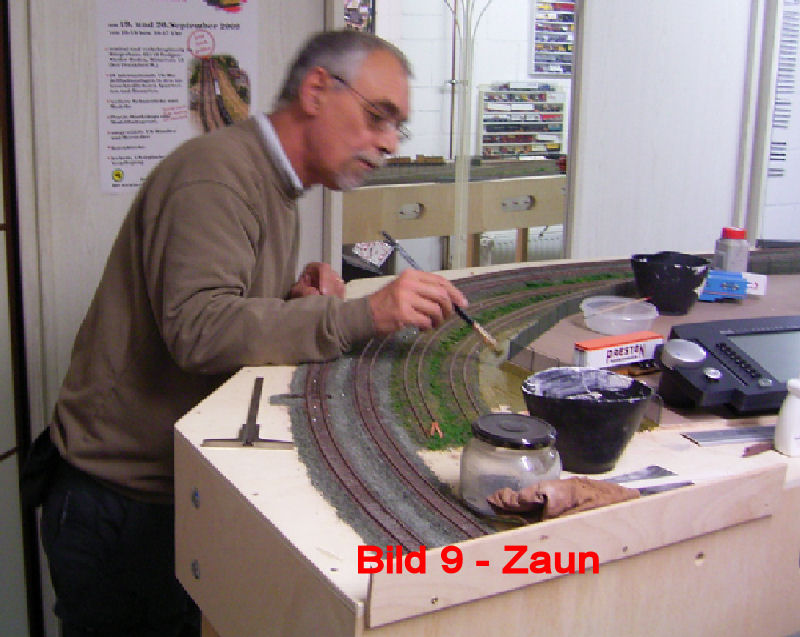 Bild 9 - Nach dem der Zaun fertig war, kam Bernd vorbei und spachtelte die Böschung an. Anschließend strich er alles mit einer mattgrünen Grundierung. Auf diese kommt dann später noch das Grünzeug und Büsche.